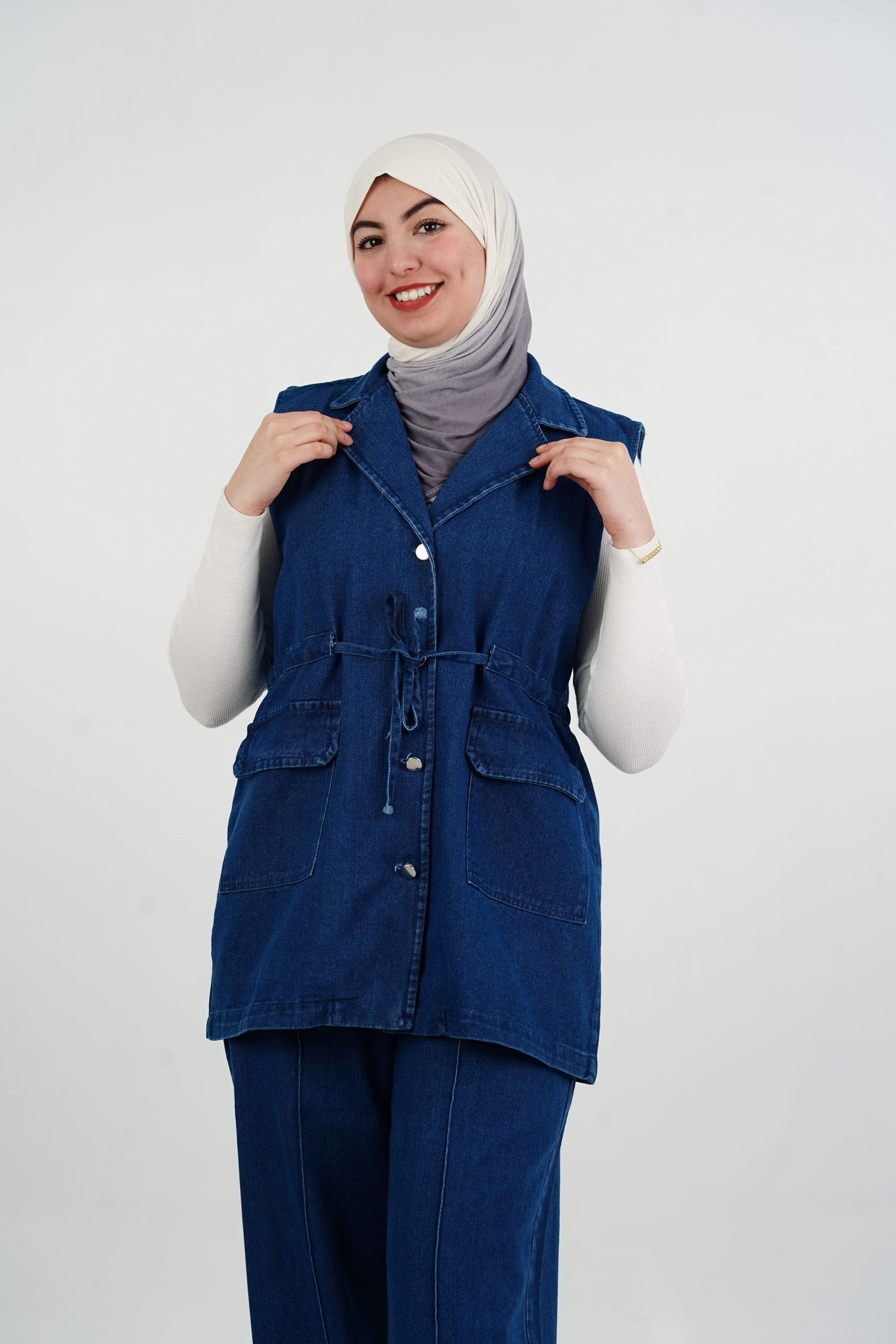 الطقم كيتكوّن من جيليه جينز مع سروال بنفس القماش، بتصميم محتشم وأنيق كيناسب مختلف الأذواق. القماش مريح فالحركة وكيدوم مع الاستعمال.